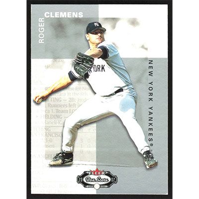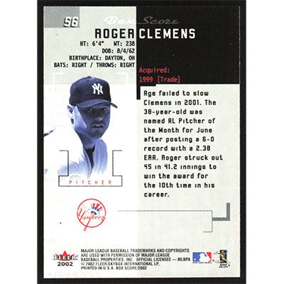This is a 2002 Fleer Box Score Roger Clemens baseball card. The card is #56 and pictures show condition.