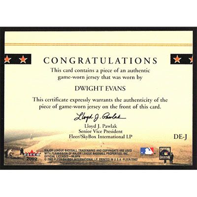 This is a 2002 Fleer Classic Cuts Game Used Dwight Evans Jersey baseball card. The card is #DE-J and pictures show condition.