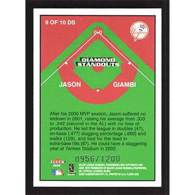 This is a 2002 Fleer Diamond Standouts Jason Giambi baseball card. The card is #9DS and pictures show condition. This card is limited; #'d 0956/1200. Team(s): New York Yankees