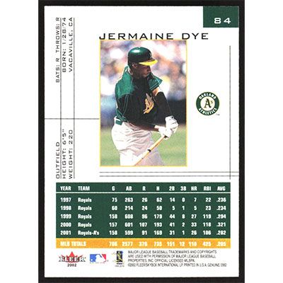 This is a 2002 Fleer Genuine Jermaine Dye baseball card. The card is #84 and pictures show condition.