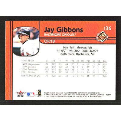 This is a 2002 Fleer Maximum Jay Gibbons baseball card. The card is #136 and pictures show condition.