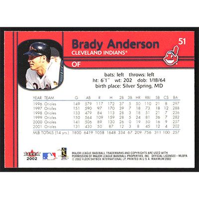This is a 2002 Fleer Maximum Brady Anderson baseball card. The card is #51 and pictures show condition.