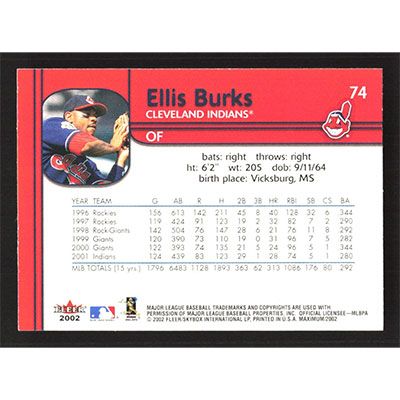 This is a 2002 Fleer Maximum Ellis Burks baseball card. The card is #74 and pictures show condition.