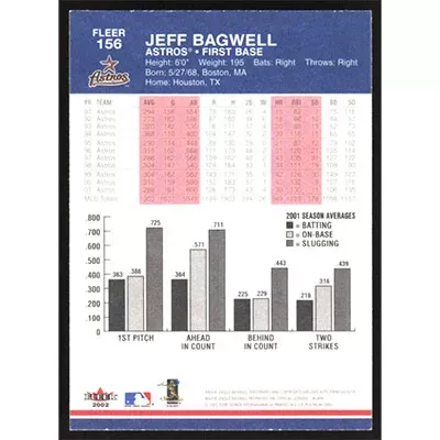This is a 2002 Fleer Platinum Jeff Bagwell baseball card. The card is #156 and pictures show condition.