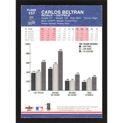 This is a 2002 Fleer Platinum Carlos Beltran baseball card. The card is #157 and pictures show condition.