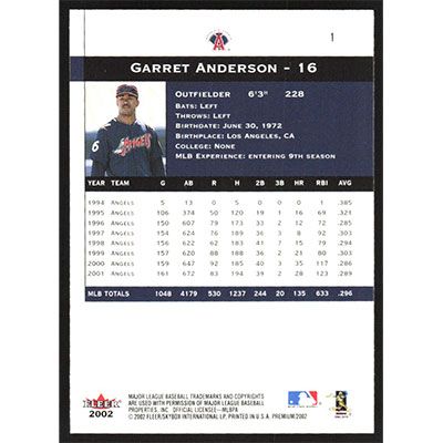 This is a 2002 Fleer Premium Garret Anderson baseball card. The card is #1 and pictures show condition.