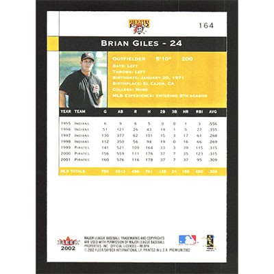 This is a 2002 Fleer Premium Brian Giles baseball card. The card is #164 and pictures show condition.