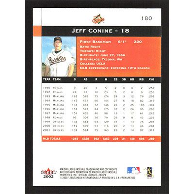 This is a 2002 Fleer Premium Jeff Conine baseball card. The card is #180 and pictures show condition.
