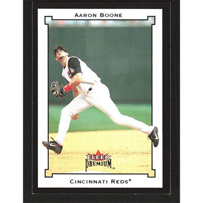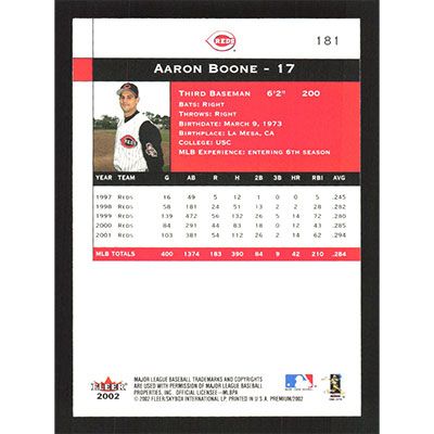 This is a 2002 Fleer Premium Aaron Boone baseball card. The card is #181 and pictures show condition.