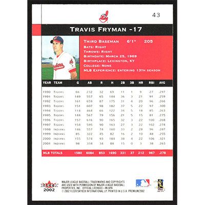 This is a 2002 Fleer Premium Travis Fryman baseball card. The card is #43 and pictures show condition.