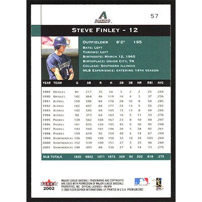 This is a 2002 Fleer Premium Steve Finley baseball card. The card is #57 and pictures show condition.