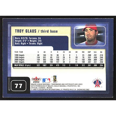This is a 2002 Fleer Showcase Troy Glaus baseball card. The card is #77 and pictures show condition.