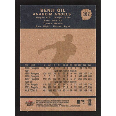 This is a 2002 Fleer Tradition Benji Gil baseball card. The card is #102 and pictures show condition.
