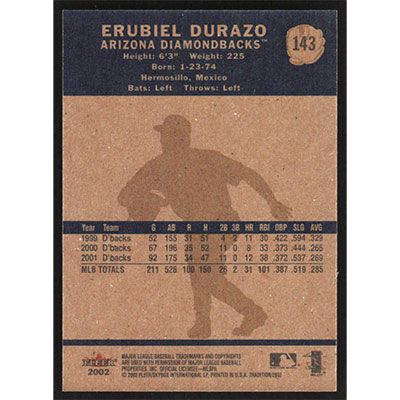 This is a 2002 Fleer Tradition Erubiel Durazo baseball card. The card is #143 and pictures show condition.