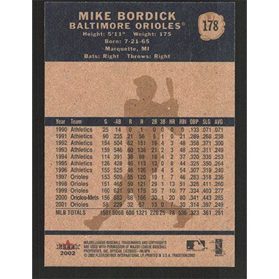 This is a 2002 Fleer Tradition Mike Bordick baseball card. The card is #178 and pictures show condition.