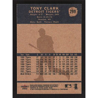 This is a 2002 Fleer Tradition Tony Clark baseball card. The card is #299 and pictures show condition.