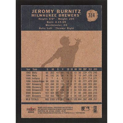 This is a 2002 Fleer Tradition Jeromy Burnitz baseball card. The card is #314 and pictures show condition.