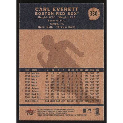 This is a 2002 Fleer Tradition Carl Everett baseball card. The card is #330 and pictures show condition.