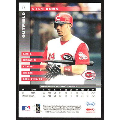 This is a 2002 Leaf Adam Dunn baseball card. The card is #17 and pictures show condition.