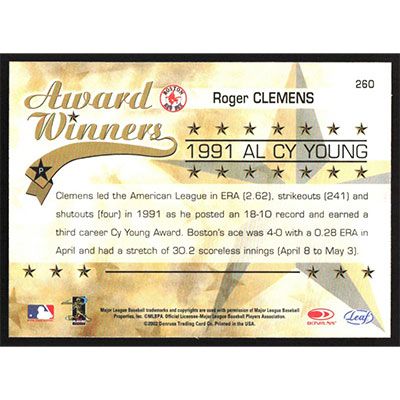 This is a 2002 Leaf Rookies & Stars Roger Clemens Award Winners baseball card. The card is #260 and pictures show condition.