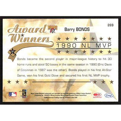 This is a 2002 Leaf Rookies & Stars Barry Bonds '90 MVP baseball card. The card is #269 and pictures show condition.