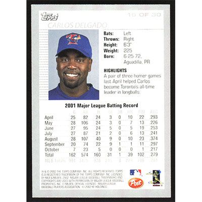 This is a 2002 Post Carlos Delgado baseball card. The card is #15 and pictures show condition.
