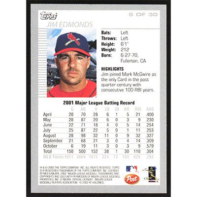 This is a 2002 Post Jim Edmonds baseball card. The card is #5 and pictures show condition.