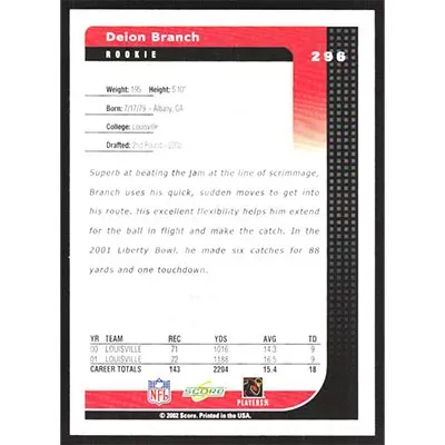 This is a 2002 Score Deion Branch football card. The card is #296 and pictures show condition.