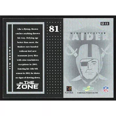 This is a 2002 Score In the Zone Tim Brown football card. The card is #IZ-11 and pictures show condition.