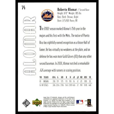 This is a 2002 SP Authentic Roberto Alomar baseball card. The card is #74 and pictures show condition.