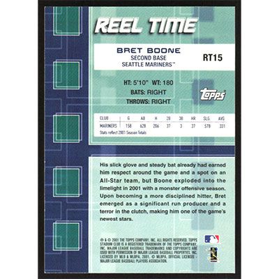 This is a 2002 Stadium Club Reel Time Bret Boone baseball card. The card is #RT15 and pictures show condition.