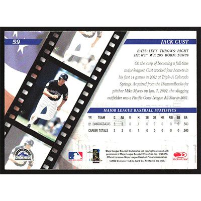 This is a 2002 Studio Jack Cust baseball card. The card is #59 and pictures show condition.