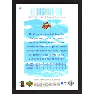This is a 2002 Sweet Spot Geronimo Gil baseball card. The card is #18 and pictures show condition.