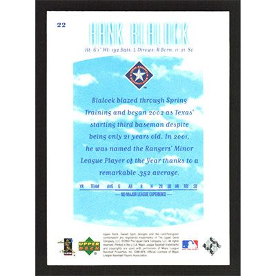 This is a 2002 Sweet Spot Hank Blalock baseball card. The card is #22 and pictures show condition.