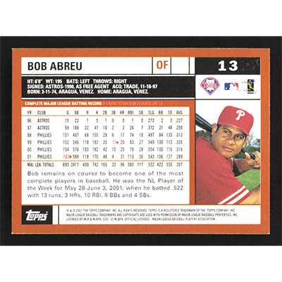 This is a 2002 Topps Bob Abreu baseball card. The card is #13 and pictures show condition.