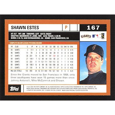 This is a 2002 Topps Shawn Estes baseball card. The card is #167 and pictures show condition.