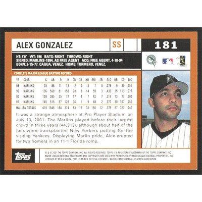 This is a 2002 Topps Alex Gonzalez baseball card. The card is #181 and pictures show condition.