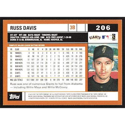 This is a 2002 Topps Russ Davis baseball card. The card is #206 and pictures show condition.
