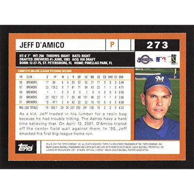 This is a 2002 Topps Jeff D'Amico baseball card. The card is #273 and pictures show condition.