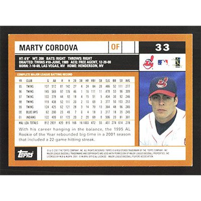 This is a 2002 Topps Marty Cordova baseball card. The card is #33 and pictures show condition.