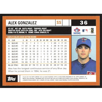 This is a 2002 Topps Alex Gonzalez baseball card. The card is #36 and pictures show condition.