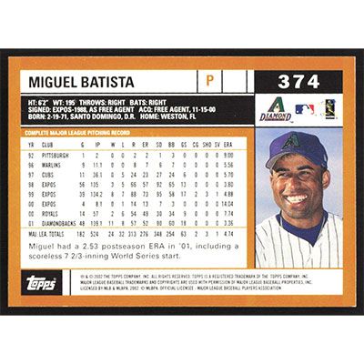This is a 2002 Topps Miguel Batista baseball card. The card is #374 and pictures show condition.