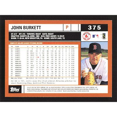 This is a 2002 Topps John Burkett baseball card. The card is #375 and pictures show condition.