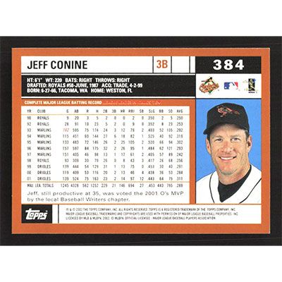 This is a 2002 Topps Jeff Conine baseball card. The card is #384 and pictures show condition.