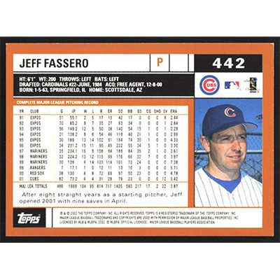 This is a 2002 Topps Jeff Fassero baseball card. The card is #442 and pictures show condition.