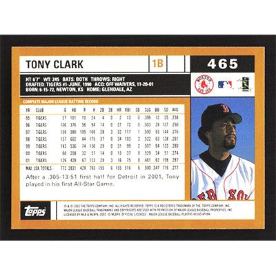 This is a 2002 Topps Tony Clark baseball card. The card is #465 and pictures show condition.