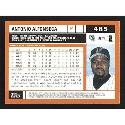This is a 2002 Topps Antonio Alfonseca baseball card. The card is #485 and pictures show condition.