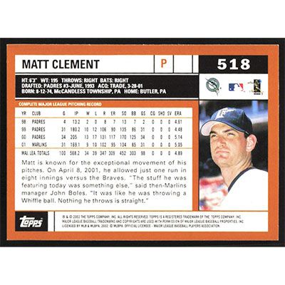 This is a 2002 Topps Matt Clement baseball card. The card is #518 and pictures show condition.