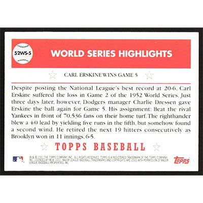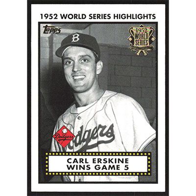 This is a 2002 Topps '52 World Series Highlights Carl Erskine baseball card. The card is #52WS-5 and pictures show condition.