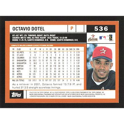 This is a 2002 Topps Octavio Dotel baseball card. The card is #536 and pictures show condition.